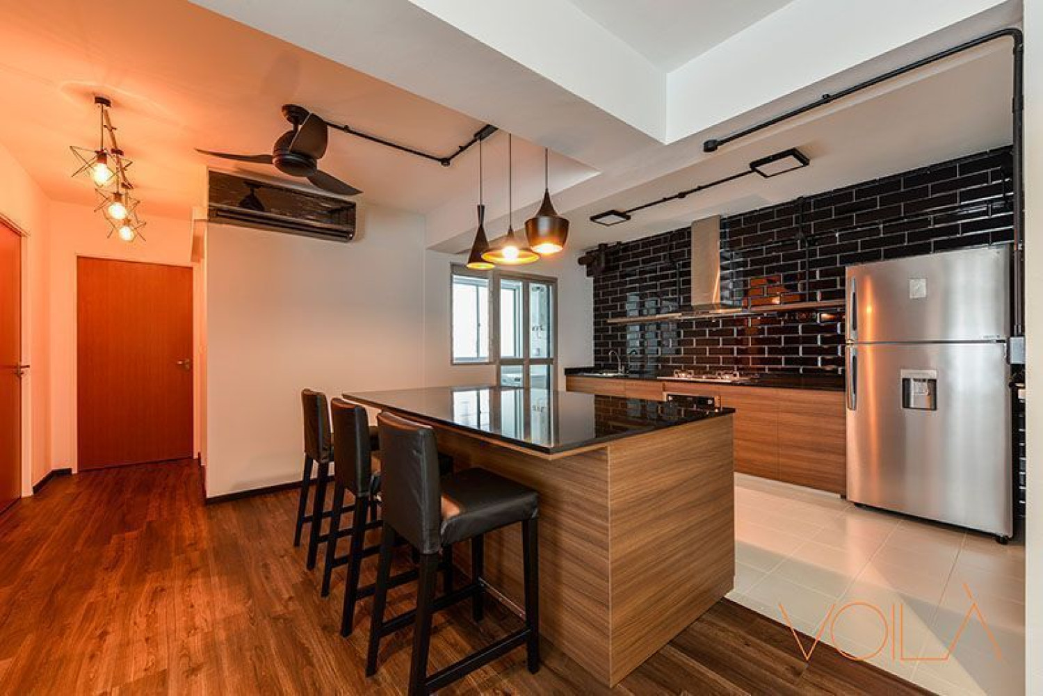 8. The spacious kitchen of this Woodlands HDB home features a long black and white kitchen island that covers cooking, washing, prepping, and even dining.