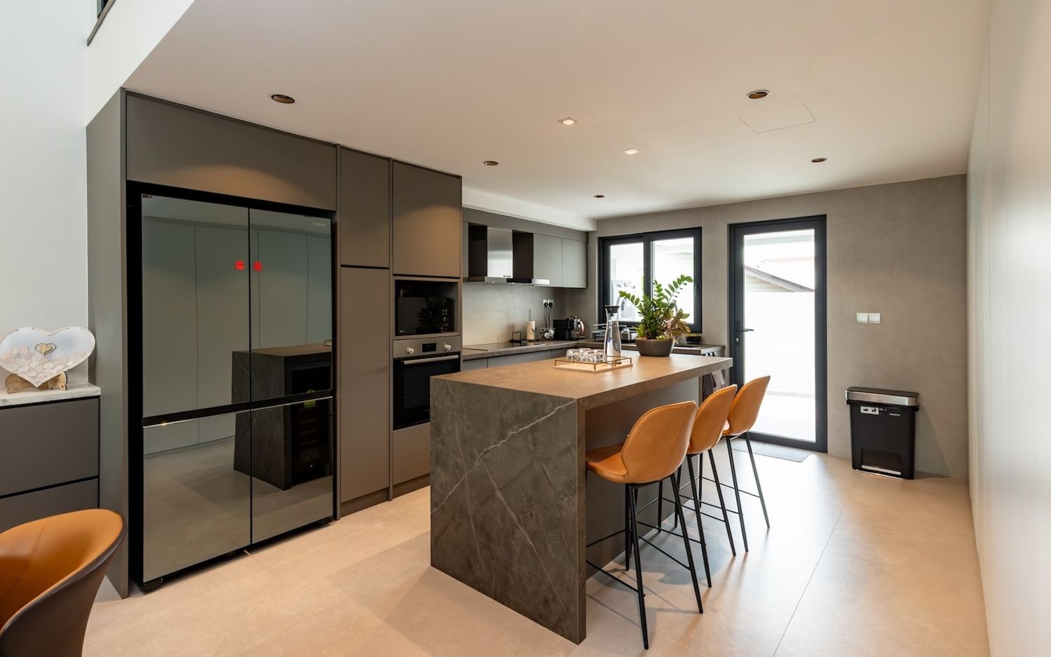 The kitchen, which sits below the mezzanine, has a ceiling height of 2.4m and glass windows and a glass door to the yard, ensuring that it is well-lit, too.