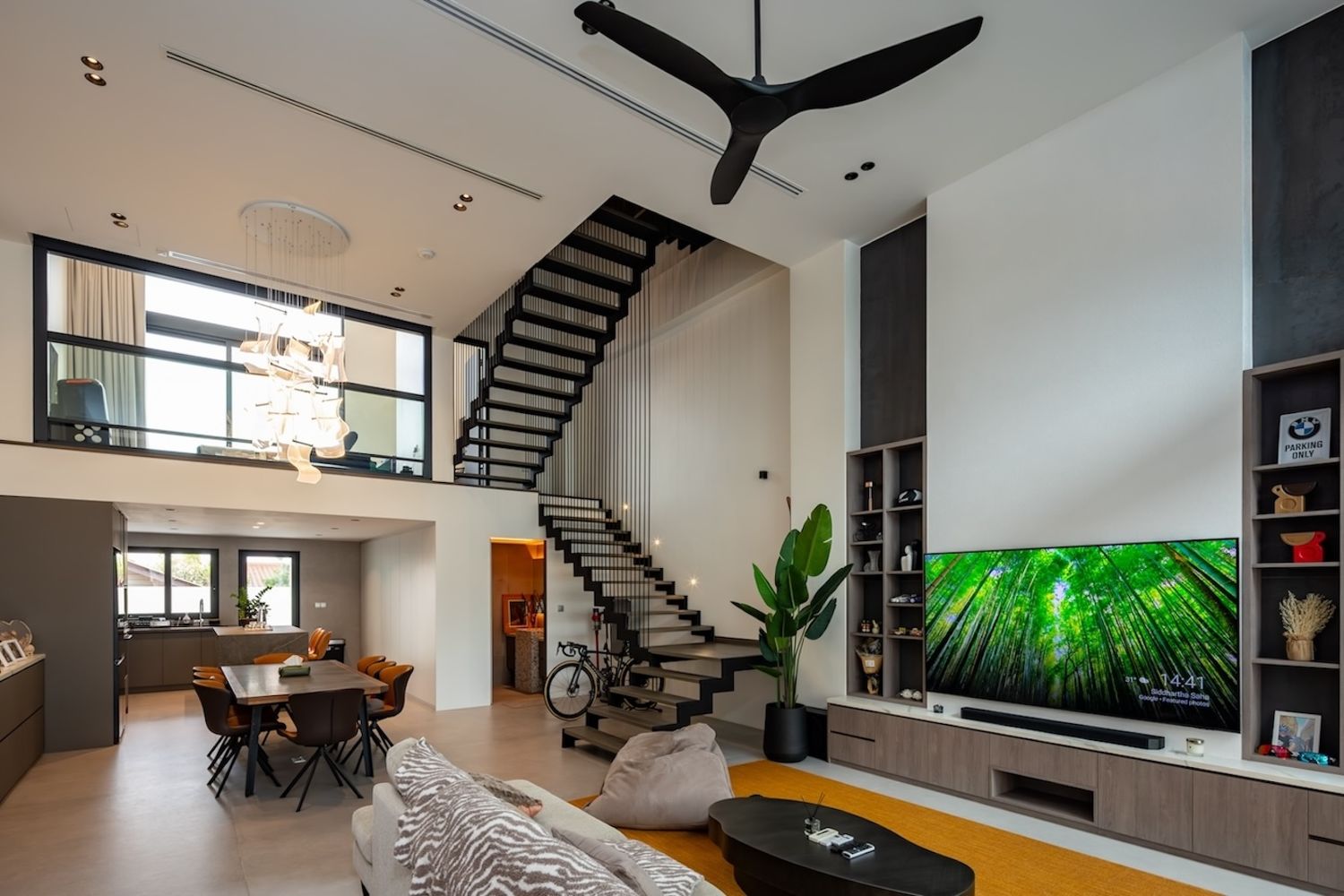 The architect Soh created a loft effect with a 5m ceiling height for the living and dining area on the first level and a 5m ceiling height for the mezzanine. The mezzanine has a full-height sliding glass window fronting the living and dining room and a view of the outside from the opposite wall. It ensures that the entire space on the mezzanine and the living and dining area is illuminated by natural light almost throughout the day.