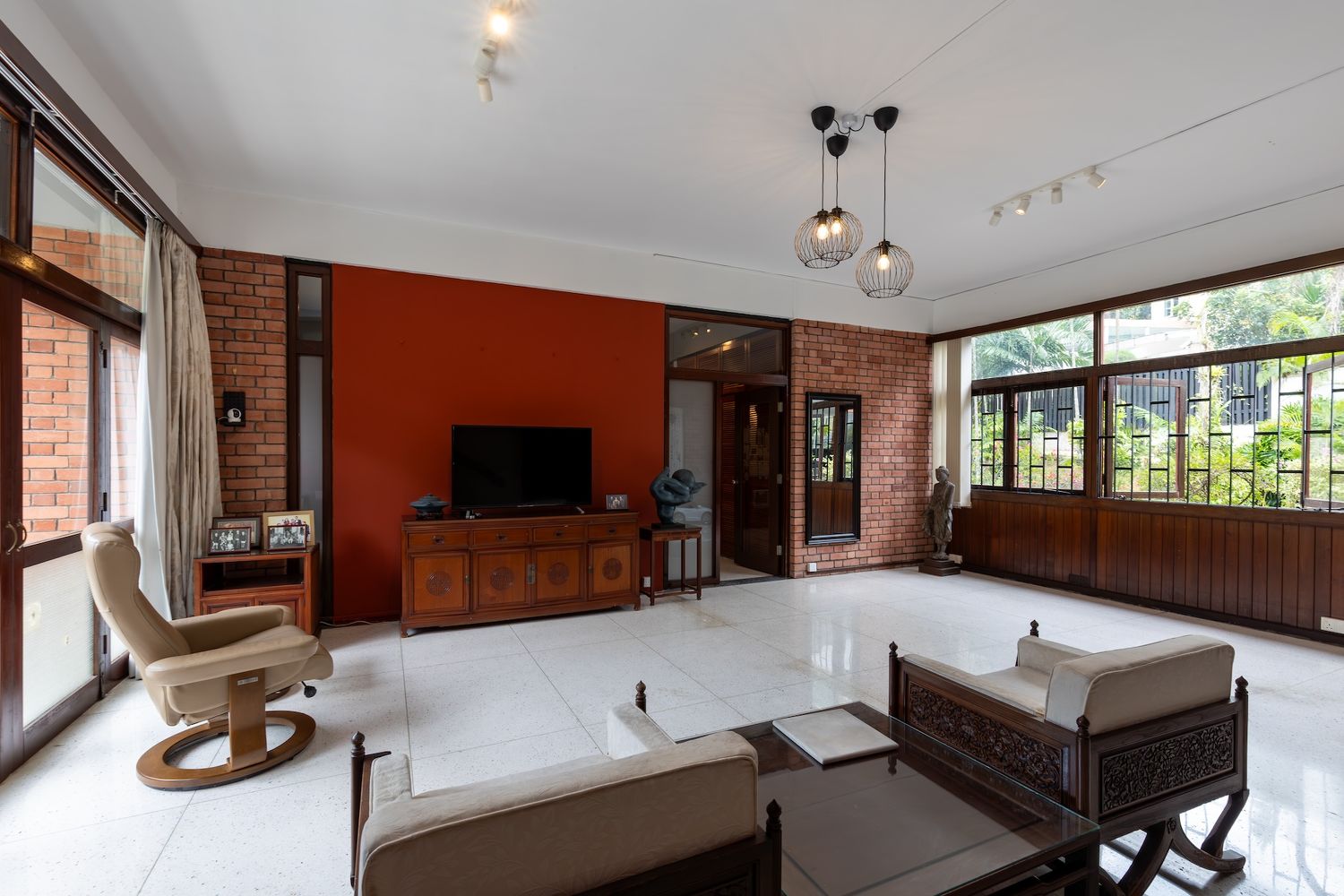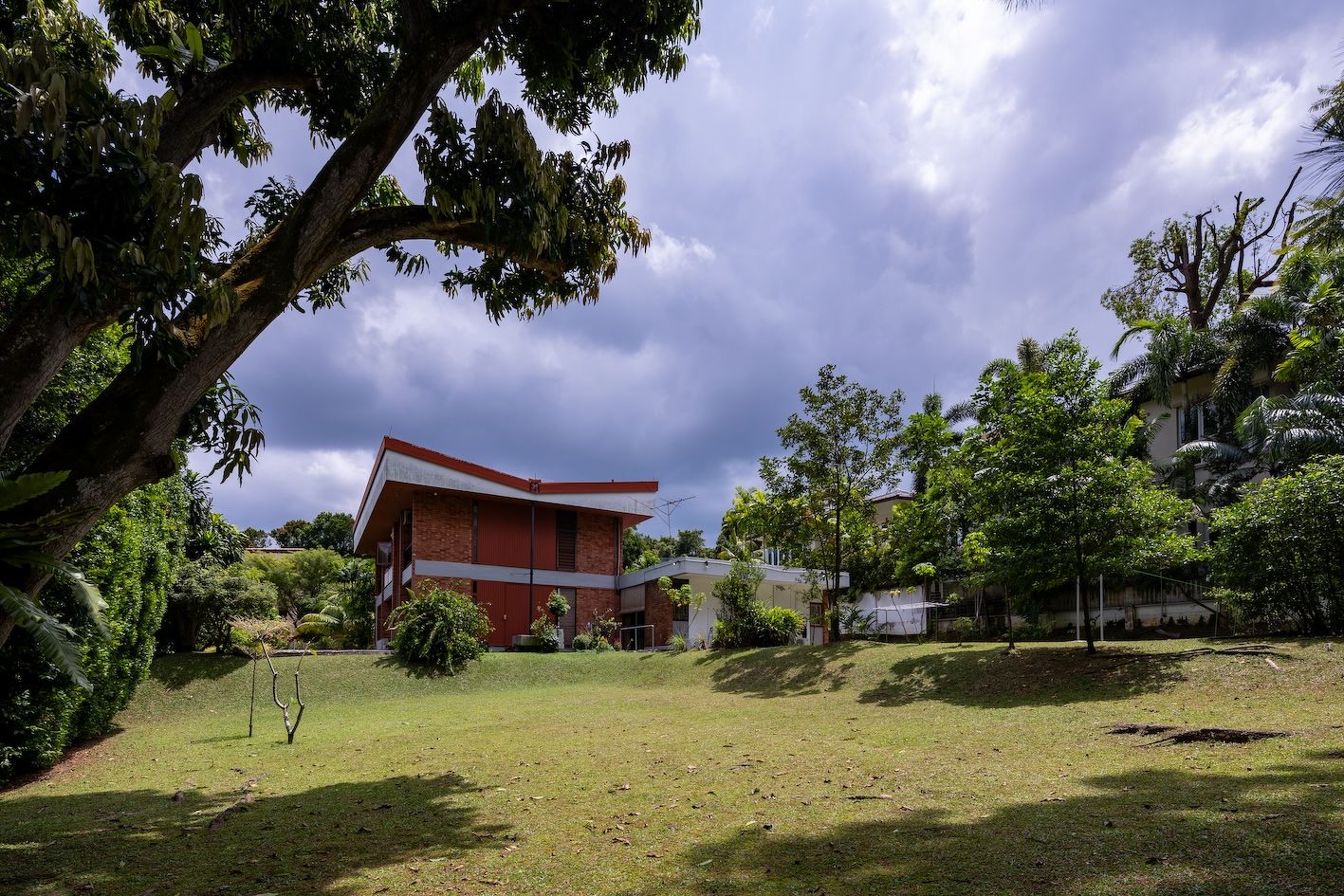 The Good Class Bungalow (GCB) at C-1 Holland Park was completed in 1963. The Midcentury Modern architecture of the house can be seen in its distinctive butterfly V-shaped roof, hybrid brick masonry, reinforced concrete structure and timber-framed fenestration.