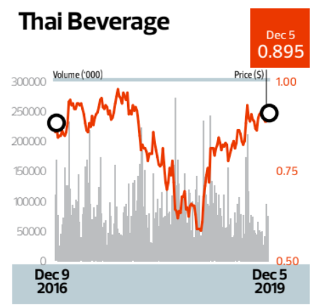 Following the Bloomberg report, ThaiBev shares rose 3% from the previous day’s close of 86.5 cents to end at 89 cents on Nov 29. The stock has since moved marginally higher to close at 89.5 cents on Dec 5, giving the company a market capitalisation of $22.48 billion. The counter has gained 46.7% year to date and is approaching its 12-month high of 93.5 cents on Aug 23.