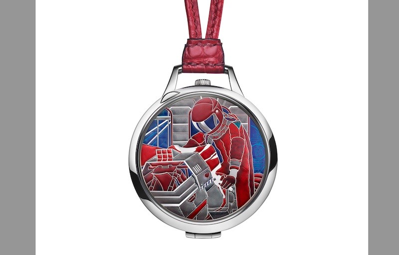 Each layer of enamel applied to the dial is meticulously dried and fired before the hand-painted red numerals and hour-markers are added. Powering the Slim d’Hermès Pocket Mysterious Rider is the Manufacture Hermès H1950 ultra-thin mechanical self-winding movement.